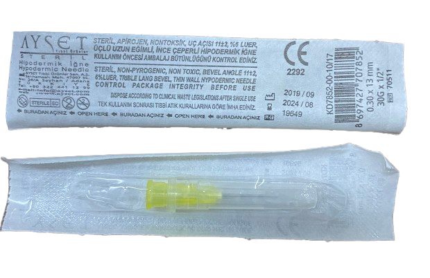 13 mm kısa uzunluğu, özellikle mezoterapi, PRP, botulinum toksin ve benzeri yüzeysel uygulamalarda yüksek kontrol sağlar. Sarı renk kodu, iğne ölçüsünün hızlı tanınmasını kolaylaştırır. Luer ve Luer Lock enjektörlerle uyumludur. Ürün steril ve tek kullanımlık olarak sunulmaktadır.