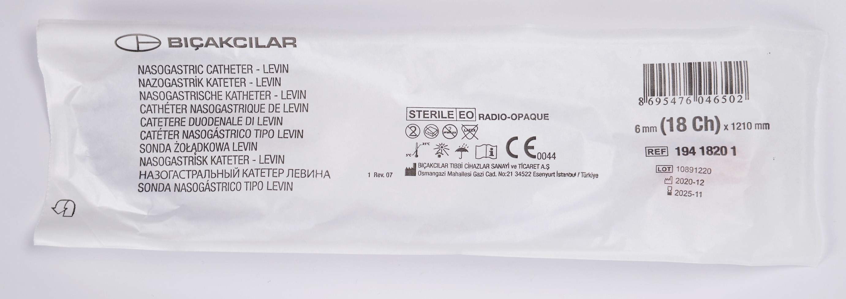 Bıçakcılar Nazogastrik Kateter (Levin) 18 CH, mide içeriğinin drenajı, beslenme ve aspirasyon işlemleri için kullanılan tek lümenli medikal nazogastrik sondadır. Levin tipi tasarımı sayesinde burun yoluyla mideye kolay ve güvenli şekilde yerleştirilebilir. Klinik ve hastane kullanımına uygundur.