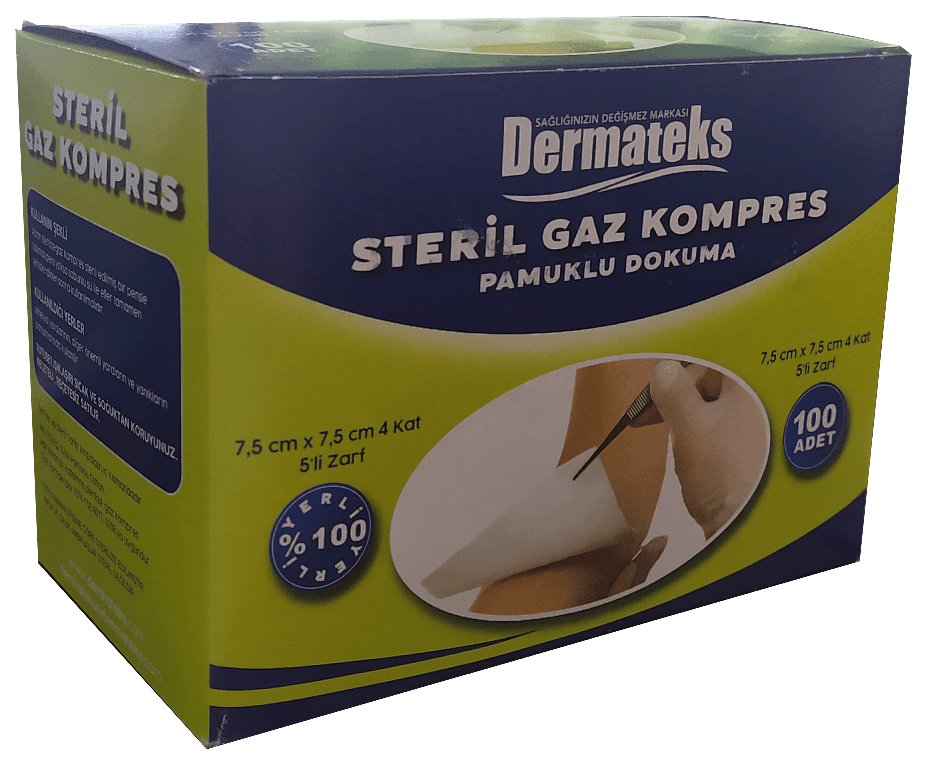 Dermateks Gaz Kompres 7,5 x 7,5 cm, yara bakımı ve medikal uygulamalarda kullanılmak üzere üretilmiş yüksek emiciliğe sahip pamuklu gaz bezidir. Yumuşak dokusu sayesinde cilt ile temasında tahriş riskini azaltır ve güvenli kullanım sunar.